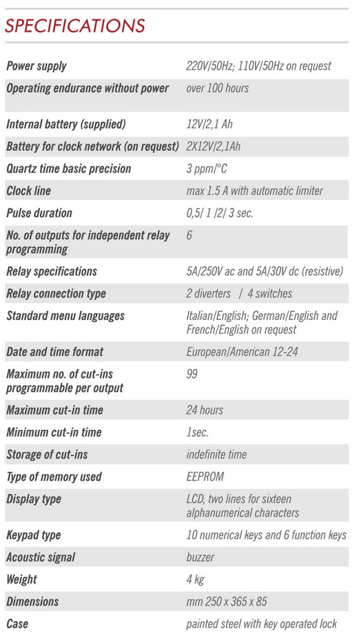 CRONOQUARZ programmer master clock is fully programmable and able to control two unrelated lines of receiver clocks and up to 6 circuits with relay for program control of any equipment connected.